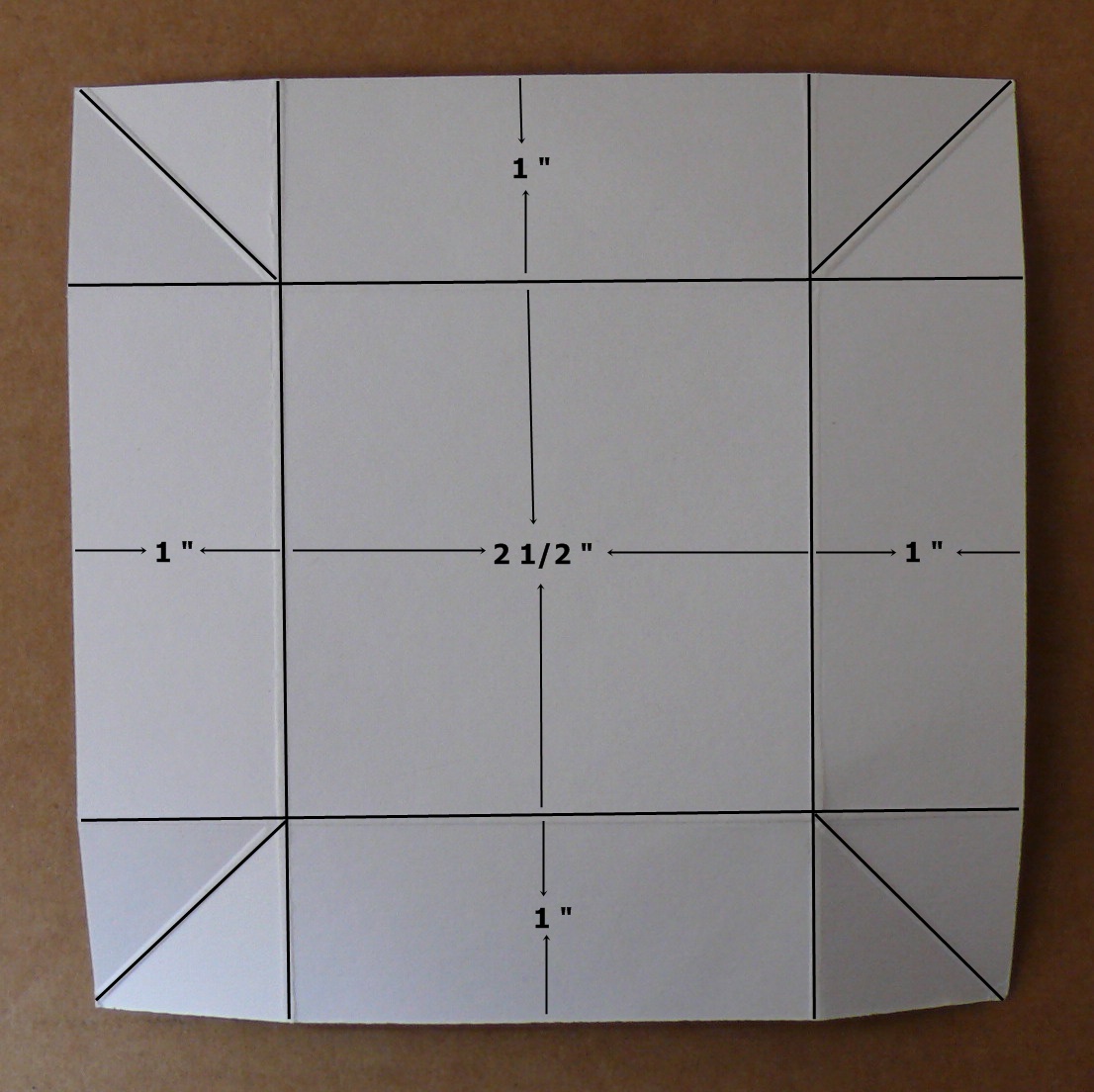 Als erstes braucht ihr ein Stück Cardstock, Pappe o.ä. in den Maßen 4,5" x 4,5". Das falzt ihr so, wie in dem nächsten Bild zu sehen ist.